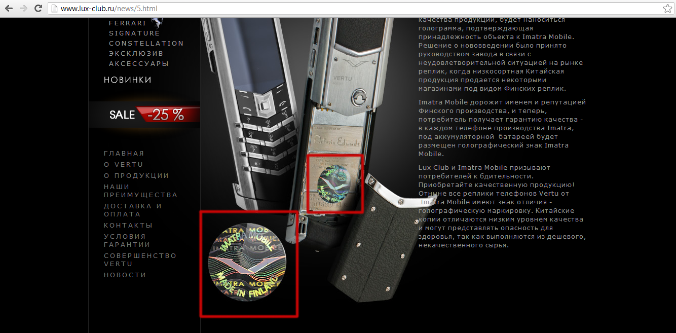ВНИМАНИЕ: В интернет магазине ruvertu.ru маркировки английских дубликатов, финских реплик и даже китайских копий телефонов и смартфонов Vertu выполнены из однородного металла и неотличимы от оригинала!